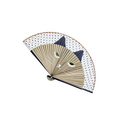 Ventaglio pieghevole in bamboo e simil raso con motivo a gatto e pois, con nappina abbinata.